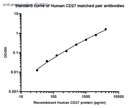 Sandwich ELISA analysis of Human CD27 matched pair antibodies Elisa assay was performed by coating wells of a 96-well plate with 100 µl per well of capture antibody (HA722973) diluted in carbonate/bicarbonate buffer, at a concentration of 2 µg/ml overnight at 4℃. Wells of the plate were washed, blocked with 150 µl 0.05% tween-20 1% BSA blocking buffer, and incubated with serial diluted Recombinant Human CD27 protein (HA210880) starting from 4000 pg/ml to 0 pg/ml and detect antibody (HA722976B, 0.2 µg/ml) for 1 hour at 30℃ with shaking. Then the plate was washed and incubated with 100 µl per well of SA-HRP for 0.5 hour at 30℃ with shaking. Detection was performed using an Ultra TMB Substrate for 10 minutes at room temperature in the dark. The reaction was stopped with sulfuric acid and absorbances were read on a spectrophotometer at 450 nm.