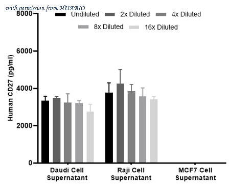 Interpolated concentrations of native CD27 in human cell culture supernatant samples. Interpolated concentration of native CD27 was measured in duplicate at different sample concentrations and interpolated from the CD27 standard curves. Undiluted samples were 100% cell supernatant. The interpolated dilution factor corrected values were plotted (mean +/- SD, n=2). The mean CD27 concentration was determined to be 3041 pg/mL in Daudi and 3777 pg/ml in Raji in cell culture supernatant, undetectable in MCF7 cell culture supernatant.
