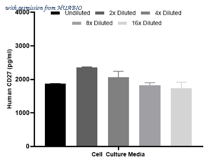 Interpolated concentrations of spiked CD27 in cell culture media samples. The concentrations of CD27 were measured in duplicates, interpolated from the CD27 standard curves and corrected for sample dilution. Undiluted samples are as follows: cell culture media 50%. The interpolated dilution factor corrected values are plotted (mean +/- SD, n=2).