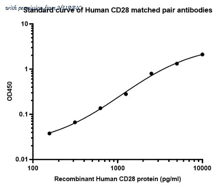 Sandwich ELISA analysis of Human CD28 matched pair antibodies Capture: HA723457, Human CD28 Rabbit mAb [PSH12-50] Detector: HA723458, Human CD28 Rabbit mAb [PSH12-51] Elisa assay was performed by coating wells of a 96-well plate with 100 µl per well of capture antibody (HA723457) diluted in carbonate/bicarbonate buffer, at a concentration of 2ug/ml overnight at 4℃. Wells of the plate were washed, blocked with 150 µl 0.05% tween-20 1% BSA blocking buffer, and incubated with serial diluted Recombinant Human CD28 protein (HA210920) starting from 10,000 pg/ml to 0 pg/ml and detect antibody (HA723458, Biotin, 0.2 µg/ml) for 1 hour at 30℃ with shaking. Then the plate was washed and incubated with 100 µl per well of SA-HRP for 0.5 hour at 30℃ with shaking. Detection was performed using an Ultra TMB Substrate for 10 minutes at room temperature in the dark. The reaction was stopped with sulfuric acid and absorbances were read on a spectrophotometer at 450 nm.