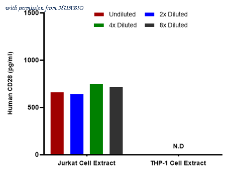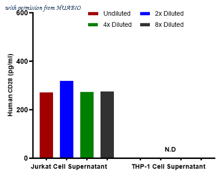 Interpolated concentrations of native CD28 in human samples. Capture: HA723457, Human CD28 Rabbit mAb [PSH12-50] Detector: HA723458, Human CD28 Rabbit mAb [PSH12-51] Interpolated concentration of native CD28 was measured in duplicate at different sample concentrations. Undiluted samples were 100% cell supernatant. The mean CD28 concentration was determined to be 275 pg/mL in Jurkat cell culture supernatant. There was no detectable signal in THP-1 cell culture supernatant.