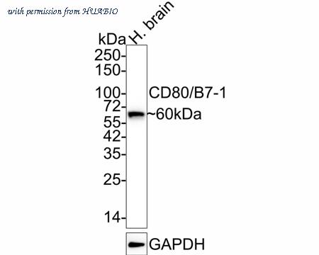 Western blot analysis of CD80 on human brain tissue lysates with Mouse anti-CD80 antibody (HA601247) at 1/1,000 dilution. Lysates/proteins at 40 µg/Lane. Predicted band size: 33 kDa Observed band size: 60 kDa Exposure time: 24 seconds; 4-20% SDS-PAGE gel. Proteins were transferred to a PVDF membrane and blocked with 5% NFDM/TBST for 1 hour at room temperature. The primary antibody (HA601247) at 1/1,000 dilution was used in 5% NFDM/TBST at 4℃ overnight. Goat Anti-Mouse IgG - HRP Secondary Antibody (HA1006) at 1/50,000 dilution was used for 1 hour at room temperature.