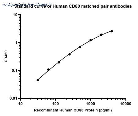 Sandwich ELISA analysis of human CD80 matched pair antibodies Elisa assay was performed by coating wells of a 96-well plate with 100 µl per well of capture antibody (HA723123) diluted in carbonate/bicarbonate buffer, at a concentration of 2ug/ml overnight at 4℃. Wells of the plate were washed, blocked with 150 µl 0.05% tween-20 1% BSA blocking buffer, and incubated with serial diluted Recombinant Human CD80 protein (HA210994) starting from 4000 pg/ml to 0 pg/ml and detect antibody (HA723124, Biotin, 0.2 µg/ml) for 1 hour at 30℃ with shaking. Then the plate was washed and incubated with 100 µl per well of SA-HRP for 0.5 hour at 30℃ with shaking. Detection was performed using an Ultra TMB Substrate for 10 minutes at room temperature in the dark. The reaction was stopped with sulfuric acid and absorbances were read on a spectrophotometer at 450 nm.