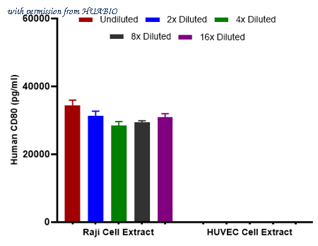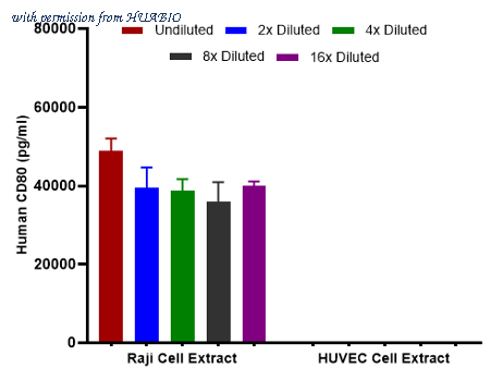 Interpolated concentrations of native CD80 in Raji and HUVEC extract samples based on a 1000 µg/ml extract load. Interpolated concentration of native CD80 was measured in duplicate at different sample concentrations and interpolated from the CD80 standard curves. The interpolated dilution factor corrected values were plotted (mean +/- SD, n=2). The mean CD80 concentration was determined to be 30,943 pg/mL in Raji cell extract, There was no detectable signal in HUVEC cell extract.
