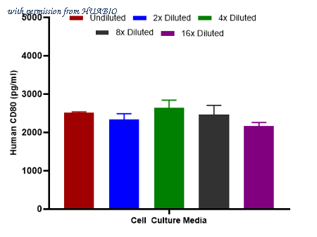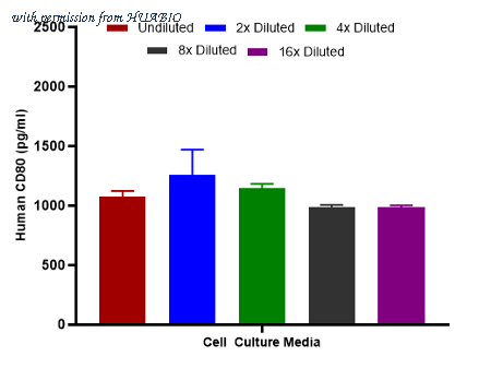 Interpolated concentrations of spiked CD80 in cell culture media samples. The concentrations of CD80 were measured in duplicates, interpolated from the CD80 standard curves and corrected for sample dilution. Undiluted samples are as follows: cell culture media 50%. The interpolated dilution factor corrected values are plotted (mean +/- SD, n=2).
