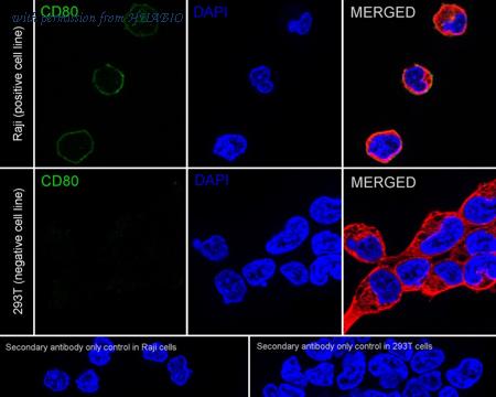 Immunocytochemistry analysis of Raji (positive) and 293T (negative) labeling CD80 with Rabbit anti-CD80 antibody (HA751321) at 1/50 dilution. Cells were fixed in 4% paraformaldehyde for 15 minutes at room temperature, permeabilized with 0.1% Triton X-100 in PBS for 15 minutes at room temperature, then blocked with 1% BSA in 10% negative goat serum for 1 hour at room temperature. Cells were then incubated with Rabbit anti-CD80 antibody (HA751321) at 1/50 dilution in 1% BSA in PBST overnight at 4 ℃. Goat Anti-Rabbit IgG H&L (iFluor™ 488, HA1121) was used as the secondary antibody at 1/1,000 dilution. PBS instead of the primary antibody was used as the secondary antibody only control. Nuclear DNA was labelled in blue with DAPI. Beta tubulin (HA601187, red) was stained at 1/100 dilution overnight at +4℃. Goat Anti-Mouse IgG H&L (iFluor™ 594, HA1126) was used as the secondary antibody at 1/1,000 dilution.