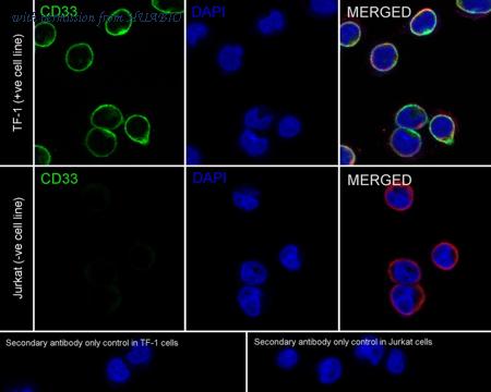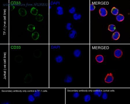 Immunocytochemistry analysis of TF-1 (positive) and Jurkat (negative) labeling CD33 with Rabbit anti-CD33 antibody (HA721826) at 1/200 dilution. Cells were fixed in 100% precooled methanol for 5 minutes at room temperature, then blocked with 1% BSA in 10% negative goat serum for 1 hour at room temperature. Cells were then incubated with Rabbit anti-CD33 antibody (HA721826) at 1/200 dilution in 1% BSA in PBST overnight at 4 ℃. Goat Anti-Rabbit IgG H&L (iFluor™ 488, HA1121) was used as the secondary antibody at 1/1,000 dilution. PBS instead of the primary antibody was used as the secondary antibody only control. Nuclear DNA was labelled in blue with DAPI. Beta tubulin (M1305-2, red) was stained at 1/100 dilution overnight at +4℃. Goat Anti-Mouse IgG H&L (iFluor™ 594, HA1126) was used as the secondary antibody at 1/1,000 dilution.