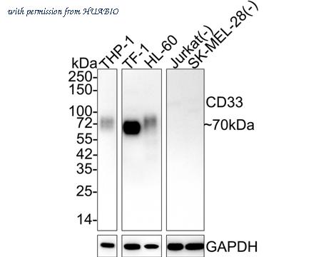 Western blot analysis of CD33 on different lysates with Rabbit anti-CD33 antibody (HA721826) at 1/2,000 dilution. Lane 1: THP-1 cell lysate Lane 2: TF-1 cell lysate Lane 3: HL-60 cell lysate Lane 4: Jurkat cell lysate (negative) Lane 5: SK-MEL-28 cell lysate (negative) Lysates/proteins at 20 µg/Lane. Predicted band size: 40 kDa Observed band size: 70 kDa Exposure time: 3 minutes; ECL: K1802; 4-20% SDS-PAGE gel. Proteins were transferred to a PVDF membrane and blocked with 5% NFDM/TBST for 1 hour at room temperature. The primary antibody (HA721826) at 1/2,000 dilution was used in 5% NFDM/TBST at 4℃ overnight. Goat Anti-Rabbit IgG - HRP Secondary Antibody (HA1001) at 1/50,000 dilution was used for 1 hour at room temperature.