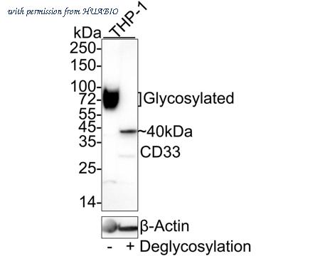 Western blot analysis of CD33 on different lysates with Rabbit anti-CD33 antibody (HA750813) at 1/1,000 dilution. Lane 1: THP-1 cell lysate Lane 2: THP-1 cell lysate treated with deglycosylation Predicted band size: 40 kDa Observed band size: 40/70 kDa (Glycosylated) Exposure time: 3 minutes; ECL: K1801; 4-20% SDS-PAGE gel. Proteins were transferred to a PVDF membrane and blocked with 5% NFDM/TBST for 1 hour at room temperature. The primary antibody (HA750813) at 1/1,000 dilution was used in 5% NFDM/TBST at 4℃ overnight. Goat Anti-Rabbit IgG - HRP Secondary Antibody (HA1001) at 1/50,000 dilution was used for 1 hour at room temperature.