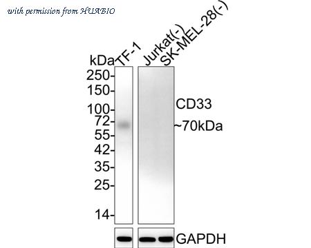 Western blot analysis of CD33 on different lysates with Rabbit anti-CD33 antibody (HA721827) at 1/2,000 dilution. Lane 1: TF-1 cell lysate Lane 2: Jurkat cell lysate (negative) Lane 3: SK-MEL-28 cell lysate (negative) Lysates/proteins at 20 µg/Lane. Predicted band size: 40 kDa Observed band size: 70 kDa Exposure time: 3 minutes; 4-20% SDS-PAGE gel. Proteins were transferred to a PVDF membrane and blocked with 5% NFDM/TBST for 1 hour at room temperature. The primary antibody (HA721827) at 1/2,000 dilution was used in 5% NFDM/TBST at 4℃ overnight. Goat Anti-Rabbit IgG - HRP Secondary Antibody (HA1001) at 1/50,000 dilution was used for 1 hour at room temperature.