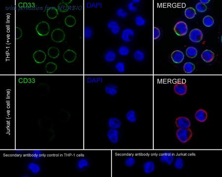 Immunocytochemistry analysis of THP-1 (positive) and Jurkat (negative) labeling CD33 with Rabbit anti-CD33 antibody (HA721827) at 1/500 dilution. Cells were fixed in 100% precooled methanol for 5 minutes at room temperature, then blocked with 1% BSA in 10% negative goat serum for 1 hour at room temperature. Cells were then incubated with Rabbit anti-CD33 antibody (HA721827) at 1/500 dilution in 1% BSA in PBST overnight at 4 ℃. Goat Anti-Rabbit IgG H&L (iFluor™ 488, HA1121) was used as the secondary antibody at 1/1,000 dilution. PBS instead of the primary antibody was used as the secondary antibody only control. Nuclear DNA was labelled in blue with DAPI. Beta tubulin (M1305-2, red) was stained at 1/100 dilution overnight at +4℃. Goat Anti-Mouse IgG H&L (iFluor™ 594, HA1126) was used as the secondary antibody at 1/1,000 dilution.