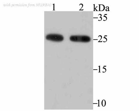 Western blot analysis of PRDX6 on PC-3M (1) and K562 (2) using anti-PRDX6 antibody at 1/500 dilution.