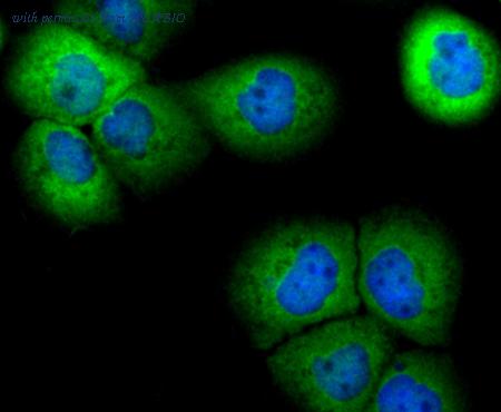 ICC staining PRDX6 (green) in PC-3M cells. The nuclear counter stain is DAPI (blue). Cells were fixed in paraformaldehyde, permeabilised with 0.25% Triton X100/PBS.