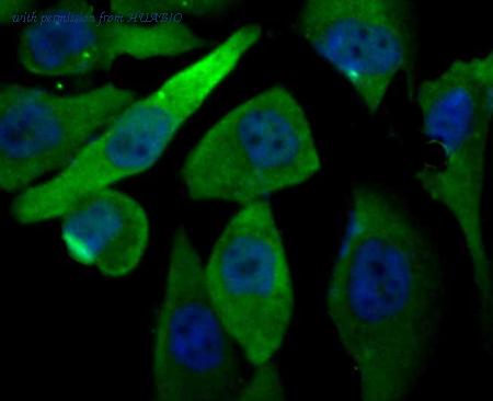 ICC staining PRDX6 (green) in A431 cells. The nuclear counter stain is DAPI (blue). Cells were fixed in paraformaldehyde, permeabilised with 0.25% Triton X100/PBS.