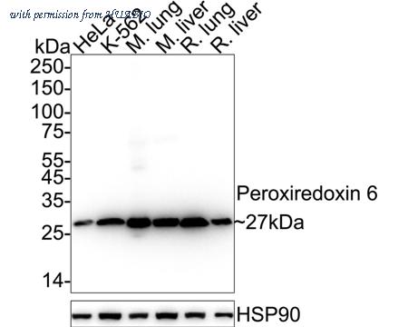 Western blot analysis of Peroxiredoxin 6 on different lysates with Mouse anti-Peroxiredoxin 6 antibody (HA601301) at 1/1,000 dilution. Lane 1: HeLa cell lysate (20 µg/Lane) Lane 2: K-562 cell lysate (20 µg/Lane) Lane 3: Mouse lung tissue lysate (40 µg/Lane) Lane 4: Mouse liver tissue lysate (40 µg/Lane) Lane 5: Rat lung tissue lysate (40 µg/Lane) Lane 6: Rat liver tissue lysate (40 µg/Lane) Predicted band size: 25 kDa Observed band size: 27 kDa Exposure time: 2 seconds; ECL: K1801; 4-20% SDS-PAGE gel. Proteins were transferred to a PVDF membrane and blocked with 5% NFDM/TBST for 1 hour at room temperature. The primary antibody (HA601301) at 1/1,000 dilution was used in 5% NFDM/TBST at 4℃ overnight. Goat Anti-Mouse IgG - HRP Secondary Antibody (HA1006) at 1/50,000 dilution was used for 1 hour at room temperature.