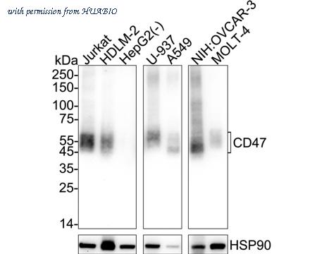 Western blot analysis of CD47 on different lysates with Rabbit anti-CD47 antibody (HA723198) at 1/2,000 dilution. Lane 1: Jurkat cell lysate Lane 2: HDLM-2 cell lysate Lane 3: HepG2 cell lysate (negative) Lane 4: U-937 cell lysate Lane 5: A549 cell lysate Lane 6: NIH:OVCAR-3 cell lysate Lane 7: MOLT-4 cell lysate Lysates/proteins at 20 µg/Lane. Predicted band size: 35 kDa Observed band size: 45-55 kDa Exposure time: Lane 1-5: 3 minutes; Lane 6-7: 25 seconds; ECL: K1801; 4-20% SDS-PAGE gel. Proteins were transferred to a PVDF membrane and blocked with 5% NFDM/TBST for 1 hour at room temperature. The primary antibody (HA723198) at 1/2,000 dilution was used in 5% NFDM/TBST at 4℃ overnight. Goat Anti-Rabbit IgG - HRP Secondary Antibody (HA1001) at 1/50,000 dilution was used for 1 hour at room temperature.