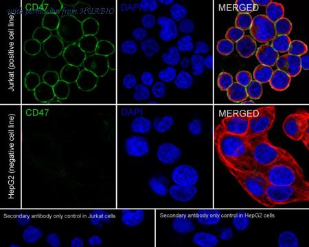 Immunocytochemistry analysis of Jurkat (positive) and HepG2 (negative) labeling CD47 with Rabbit anti-CD47 antibody (HA723198) at 1/250 dilution. Cells were fixed in 4% paraformaldehyde for 15 minutes at room temperature, permeabilized with 0.1% Triton X-100 in PBS for 15 minutes at room temperature, then blocked with 1% BSA in 10% negative goat serum for 1 hour at room temperature. Cells were then incubated with Rabbit anti-CD47 antibody (HA723198) at 1/250 dilution in 1% BSA in PBST overnight at 4 ℃. Goat Anti-Rabbit IgG H&L (iFluor™ 488, HA1121) was used as the secondary antibody at 1/1,000 dilution. PBS instead of the primary antibody was used as the secondary antibody only control. Nuclear DNA was labelled in blue with DAPI. Beta tubulin (HA601187, red) was stained at 1/100 dilution overnight at +4℃. Goat Anti-Mouse IgG H&L (iFluor™ 594, HA1126) was used as the secondary antibody at 1/1,000 dilution.