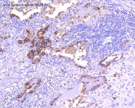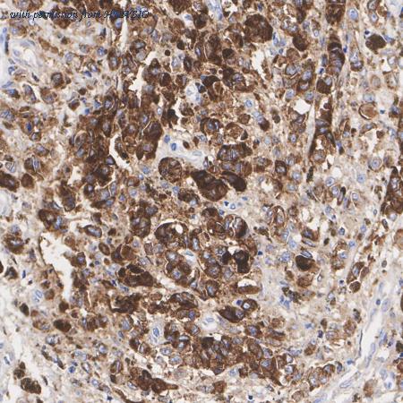 Immunohistochemical analysis of paraffin-embedded human lung carcinoma tissue using anti-CD63 antibody. The section was pre-treated using heat mediated antigen retrieval with Tris-EDTA buffer (pH 8.0-8.4) for 20 minutes.The tissues were blocked in 5% BSA for 30 minutes at room temperature, washed with ddH2O and PBS, and then probed with the primary antibody (HA750112, 1/200) for 30 minutes at room temperature. The detection was performed using an HRP conjugated compact polymer system. DAB was used as the chromogen. Tissues were counterstained with hematoxylin and mounted with DPX.