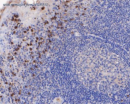 Immunohistochemical analysis of paraffin-embedded human tonsil tissue using anti-CD63 antibody. The section was pre-treated using heat mediated antigen retrieval with Tris-EDTA buffer (pH 8.0-8.4) for 20 minutes.The tissues were blocked in 5% BSA for 30 minutes at room temperature, washed with ddH2O and PBS, and then probed with the primary antibody (HA750112, 1/200) for 30 minutes at room temperature. The detection was performed using an HRP conjugated compact polymer system. DAB was used as the chromogen. Tissues were counterstained with hematoxylin and mounted with DPX.