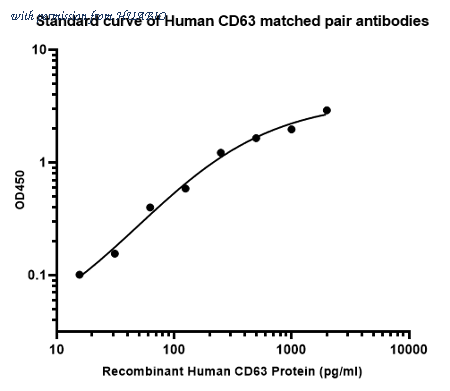Sandwich ELISA analysis of Human CD63 matched pair antibodies Elisa assay was performed by coating wells of a 96-well plate with 100 µl per well of capture antibody (HA722988) diluted in carbonate/bicarbonate buffer, at a concentration of 2ug/ml overnight at 4℃. Wells of the plate were washed, blocked with 150 µl 0.05% tween-20 1%BSA blocking buffer, and incubated with serial diluted Recombinant Human CD63 Protein (HA210764) starting from 2000 pg/ml to 0 pg/ml and detect antibody (HA722989, Biotin, 0.2 µg/ml) for 1 hour at 30℃ with shaking. Then the plate was washed and incubated with 100 µl per well of SA-HRP for 0.5 hour at 30℃ with shaking. Detection was performed using an Ultra TMB Substrate for 10 minutes at room temperature in the dark. The reaction was stopped with sulfuric acid and absorbances were read on a spectrophotometer at 450 nm.