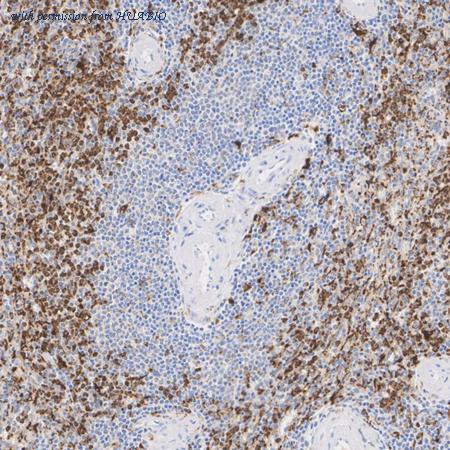 Immunohistochemical analysis of paraffin-embedded human spleen tissue with Rat anti-CD68 antibody (HA601520) at 1/500 dilution. The section was pre-treated using heat mediated antigen retrieval with Tris-EDTA buffer (pH 9.0) for 20 minutes. The tissues were blocked in 1% BSA for 20 minutes at room temperature, washed with ddH2O and PBS, and then probed with the primary antibody (HA601520) at 1/500 dilution for 1 hour at room temperature. The detection was performed using an HRP conjugated compact polymer system. DAB was used as the chromogen. Tissues were counterstained with hematoxylin and mounted with DPX.