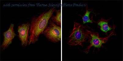 Immunofluorescence analysis of Hela (left) and HepG2 (right) cells using EphB2 antibody (green). Red: Actin filaments have been labeled with DY-554 phalloidin. Blue: DRAQ5 fluorescent DNA dye.