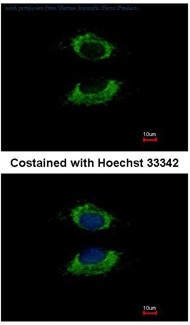 Immunofluorescence analysis of methanol-fixed HeLa cells using PA5-21569 anti-Adenylate kinase 3 antibody at 1:100 dilution.
