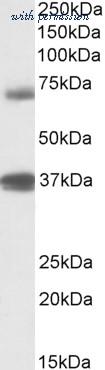Western Blot staining of Human Peripheral Lymphocytes lysate using PA5-19248 at a concentration of 1.0 ug/ml, the primary antibody incubation was 1 hour and the detection method was chemiluminescence.