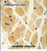 Immunohistochemical analysis in formalin fixed and paraffin embedded skeletal muscle followed by peroxidase conjugation of the secondary antibody and DAB staining.