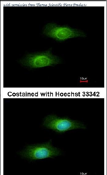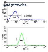 Flow cytometric analysis of 293 cells (bottom histogram) compared to a negative control cell (top histogram). FITC-conjugated goat-anti-rabbit secondary antibodies were used for the analysis.