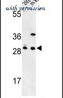 Western blot analysis of GCLM in 293 cell line and mouse kidney tissue lysates using 35ug per lane of antibody.