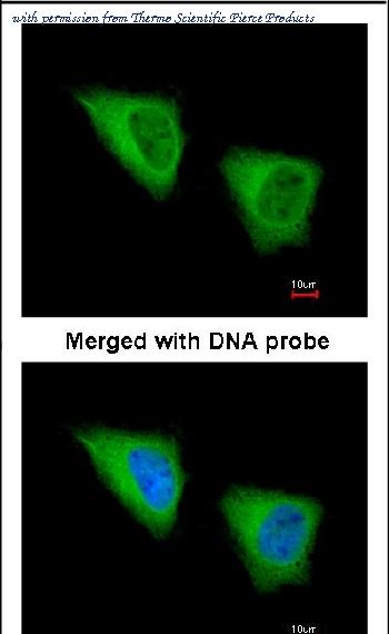 Immunofluorescence analysis of paraformaldehyde-fixed HeLa cells using GCLM (PA5-29384) antibody at 1:200 dilution.