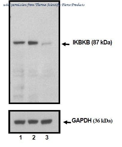 A549 cells were lysed 72 hours after transfection. Cells were transfected with Transfection Reagent alone (Lane 1), 100nM ON-TARGETplus siCONTROL Non-Targeting Pool (Lane 2), or 100nM ON-TARGETplus IKBKB siRNA (Lane 3). Western blot data for GAPDH is included as a control for equal protein loading.