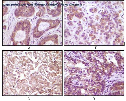 Immunohistochemical analysis of paraffin-embedded human colon carcinoma(A), breast carcinoma(B), kidney cell carcinoma(C), bladder carcinoma tumor(D), showing membrane and cytoplasmic localization using IKBKB antibody with DAB staining.