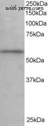 Western Blot staining of Human Testes lysate using PA5-18238 at a concentration of 0.1 ug/ml, the primary antibody incubation was 1 hour and the detection method was chemiluminescence.