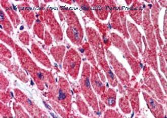 Immunohistochemical staining of paraffin embedded of Human Heart using PA5-18238 at a concentration of 5 ug/ml. The tissue was processed by steamed antigen retrieval with citrate buffer pH 6 and stained with AP.