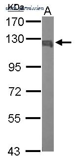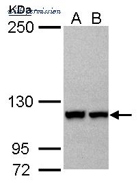 Western Blot analysis using anti-IPO5 Polyclonal Antibody on the following cells: (30 ug of whole cell lysate) A: NT2D1 B: Hela. Primary antibody (PA5-30076) diluted at 1:2000