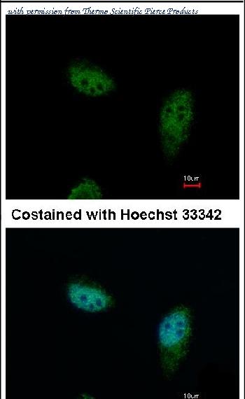 Immunofluorescence analysis of paraformaldehyde-fixed HeLa cells using IPO5 (PA5-30076) antibody at 1:500 dilution.