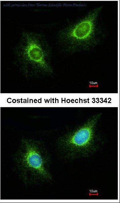 Immunofluorescence analysis of methanol-fixed HeLa cells using PA5-21514 anti-Laminin beta 3 antibody at 1:200 dilution.