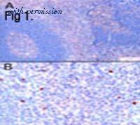 Immunohistochemical staining of FOXP3 in paraffin embedded human tonsil using PA1-9044. A) Nuclear staining of scattered cells in the interfollicular area. B) High magnification of positive cells.
