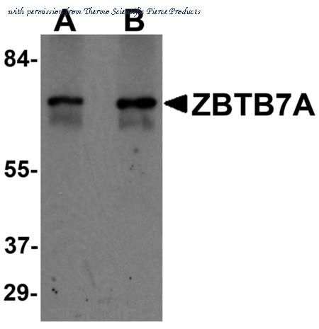 Western blot analysis of human ovary tissue lysate using PA5-21087 anti-ZBTB7A antibody at (A) 1 and (B) 2 ug/mL.