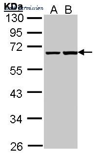 Western Blot analysis using anti-PHF1 Polyclonal Antibody on the following cells: (30 ug of whole cell lysate) A: A431 cell lysate B: H1299. Primary antibody (PA5-27568) diluted at 1:1000