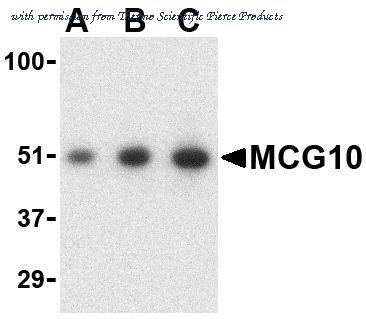 Western blot analysis of MCG10 in HeLa cell lysate with MCG10 antibody at (A) 0.5, (B) 1 and (C) 2 ug/mL.