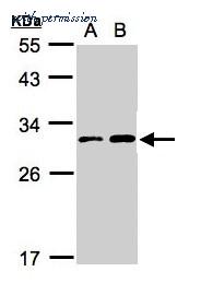 Western Blot analysis using anti-TIGAR Polyclonal Antibody on the following cells: (30 ug whole cell lysate) A:Hep G2 cell lysate B:MOLT4 cell lysate. Primary antibody (PA5-29151) diluted at 1:3000