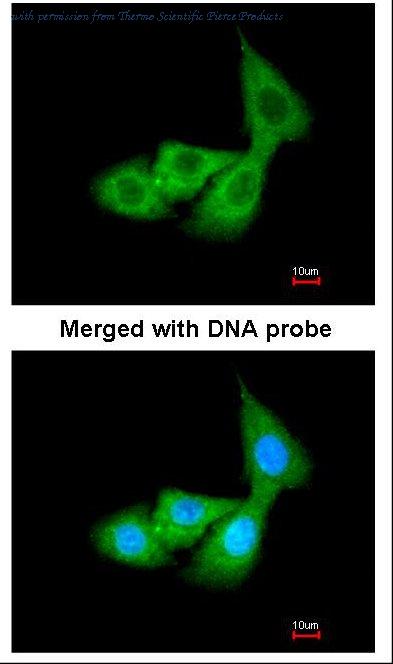 Immunofluorescence analysis of paraformaldehyde-fixed A549 cells using PA5-22097 anti-Cortisol Binding Globulin antibody at 1:200 dilution.