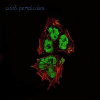 Immunofluorescence analysis of NTERA-2 cells using SOX2 antibody (green). Red: Actin filaments have been labeled with Alexa Fluor-555 phalloidin.