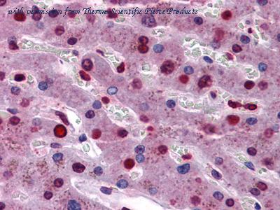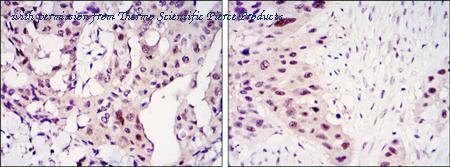 Immunohistochemistry was performed on biopsies of normal and cancer tissues. To expose target proteins heat induced antigen retrieval was performed using 10mM sodium citrate (pH6.0) buffer for 20 minutes at 95°C. Following antigen retrieval tissues were blocked in 10% normal goat serum (Product #31873) for 20 minutes at room temperature. Tissues were then probed at a dilution of 1:1600 with a mouse monoclonal antibody recognizing STAT3 (Product # MA1-13042) overnight at 4°C in a humidified chamber. Detection was performed using a goat anti-mouse HRP secondary antibody followed by colorimetric detection using DAB substrate. Tissues were counterstained with hematoxylin and prepped for mounting. Images were taken at 400X magnification. Results demonstrate both nuclear and cytoplasmic localization of STAT3.