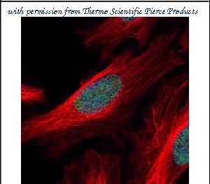 Confocal immunofluorescence analysis of paraformaldehyde-fixed HeLa using ZNF38 (PA5-28154) antibody (Green) at 1:500 dilution. Alpha-tubulin filaments were labeled with MA1-25054 (Red) at 1:2000.
