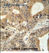 Immunohistochemical analysis in formalin fixed and paraffin embedded human colon carcinoma followed by peroxidase conjugation of the secondary antibody and DAB staining.