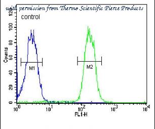 Flow cytometric analysis of MDA-MB435 cells (right histogram) compared to a negative control cell (left histogram). FITC-conjugated goat-anti-rabbit secondary antibodies were used for the analysis.